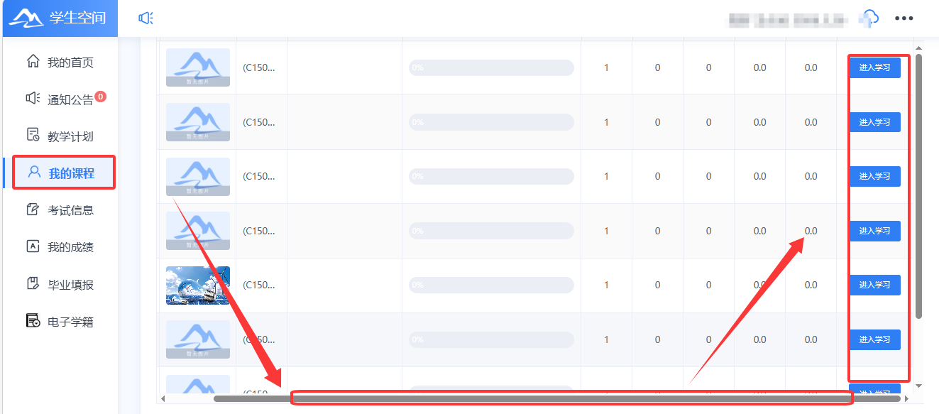 3.登录学习平台后点击左侧【我的课程】拖动滚动条点击右侧【进入学习】按钮开始学习。
